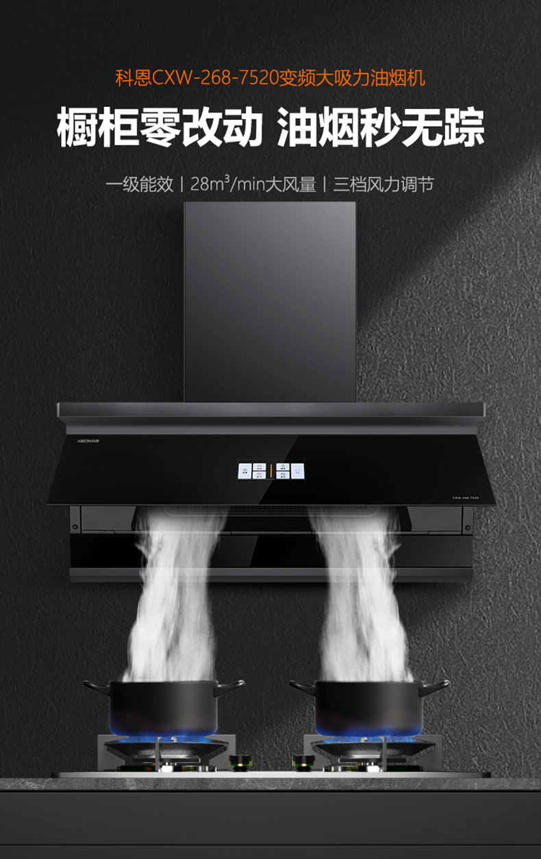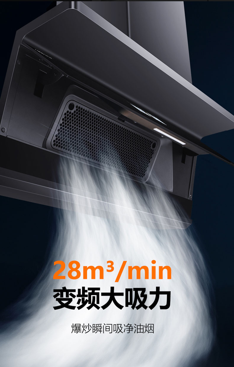 - 28m³/min飓风吸力,爆炒瞬间吸净油烟
