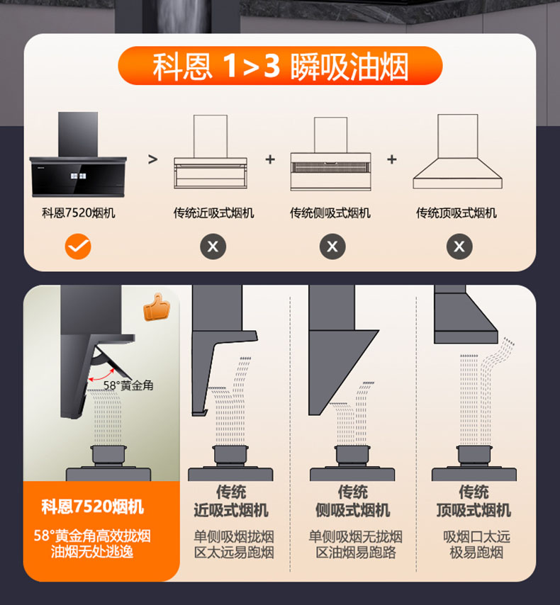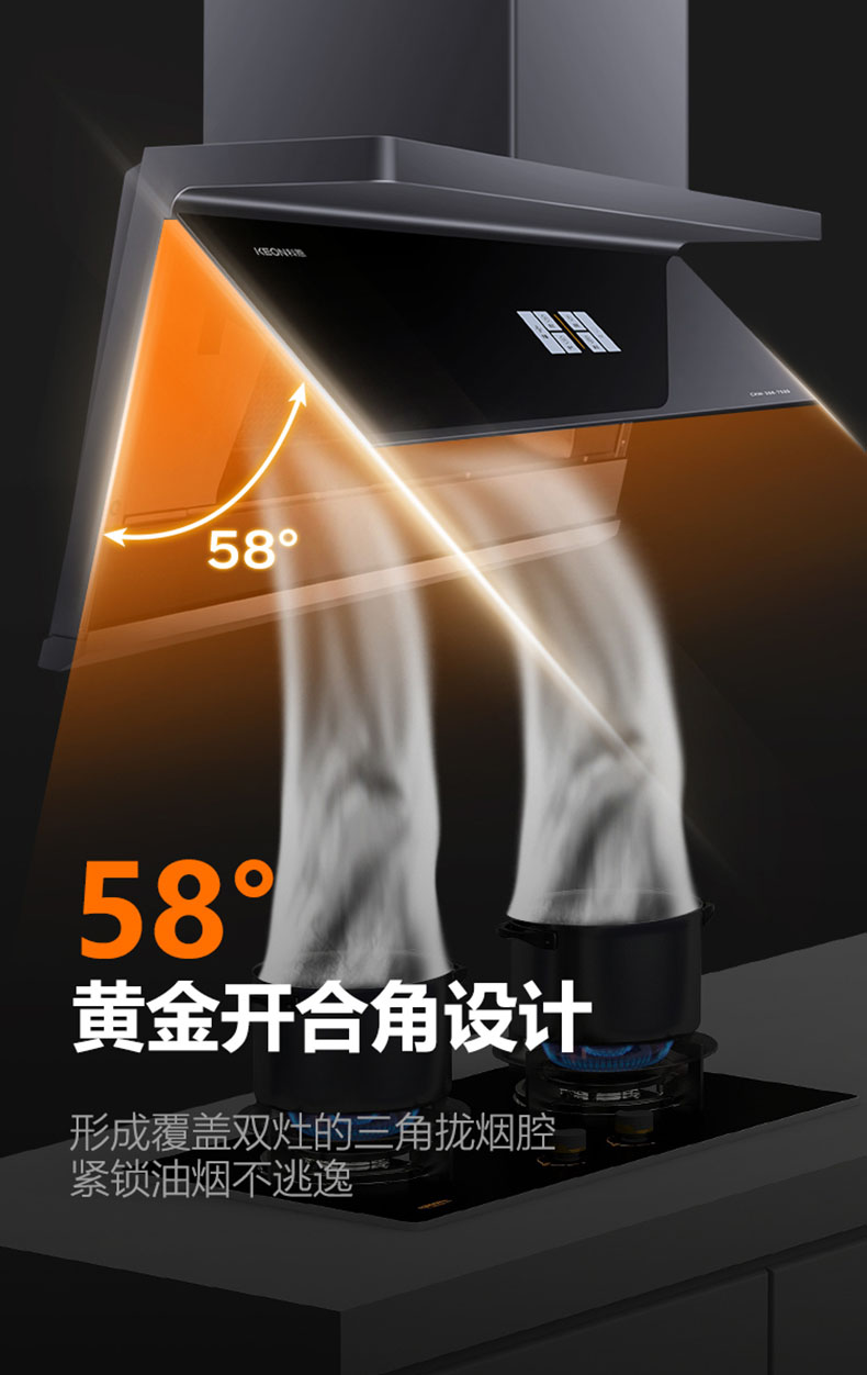- 采用58°黄金开合角,紧锁油烟不逃逸