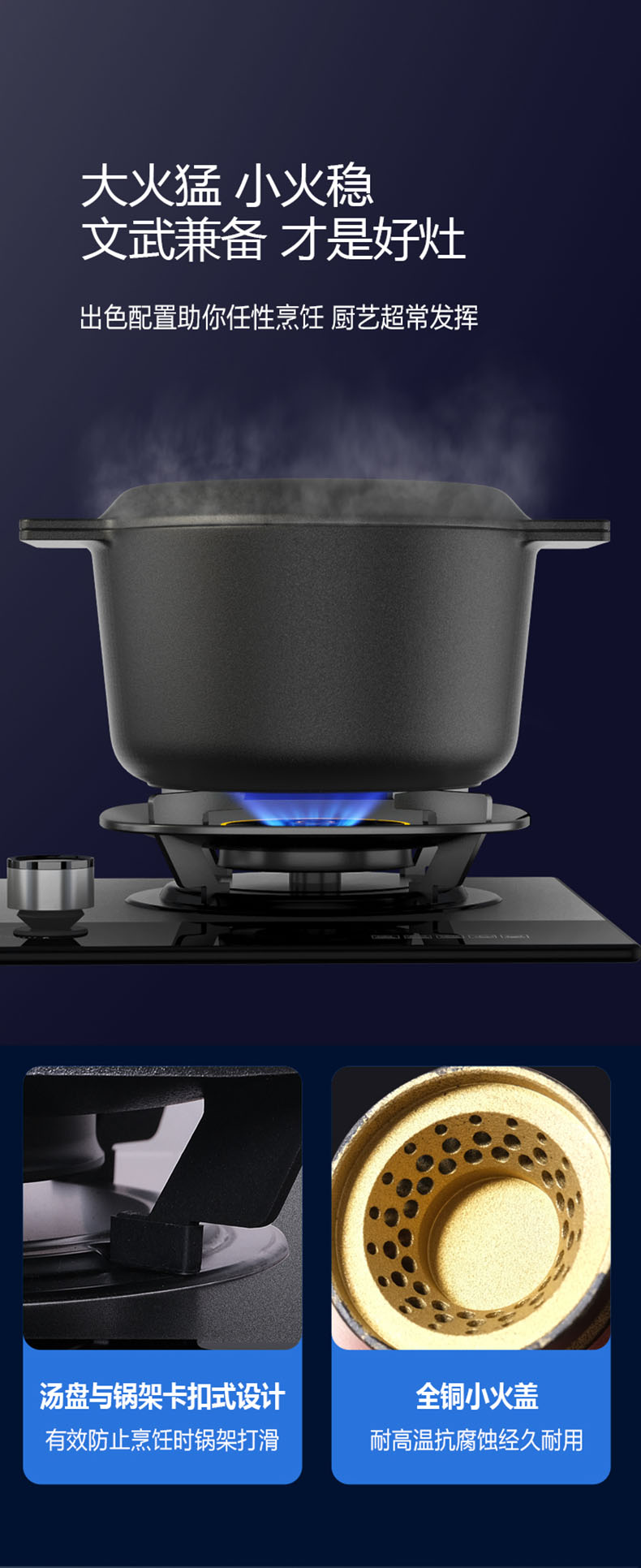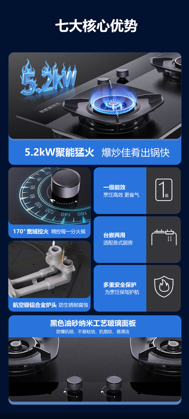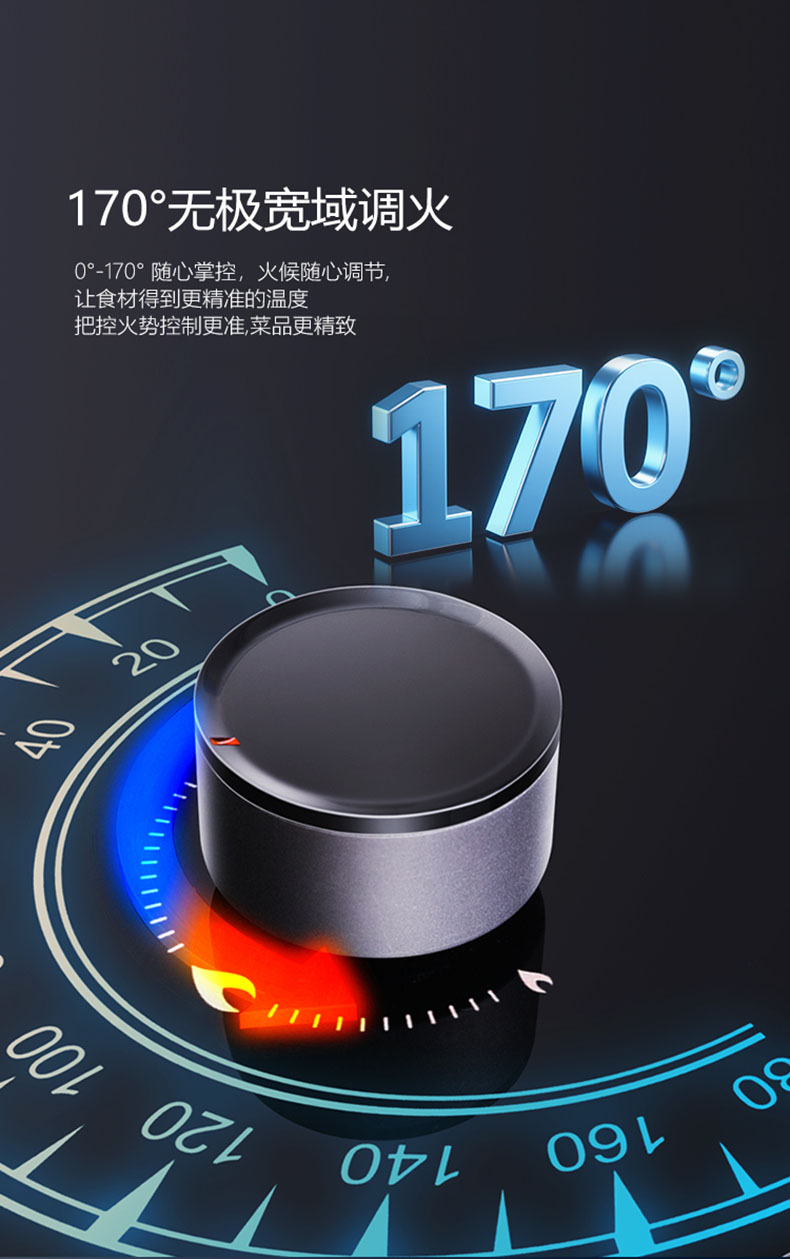 - 无极宽域调火,0°-170° 随心掌控,火候自如