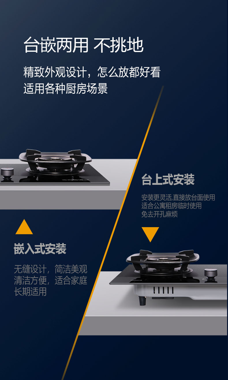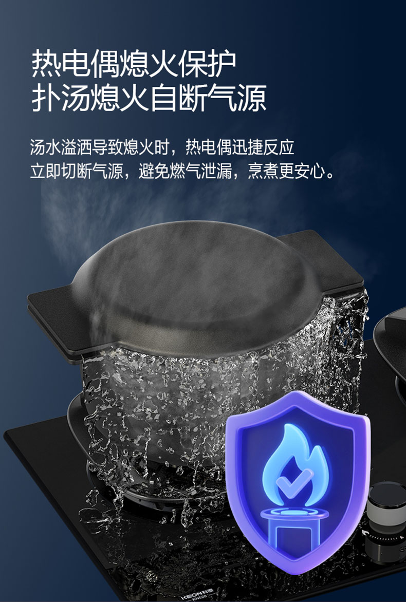 - 意外熄火?;?,火灭即刻切断气源,保障厨房安全